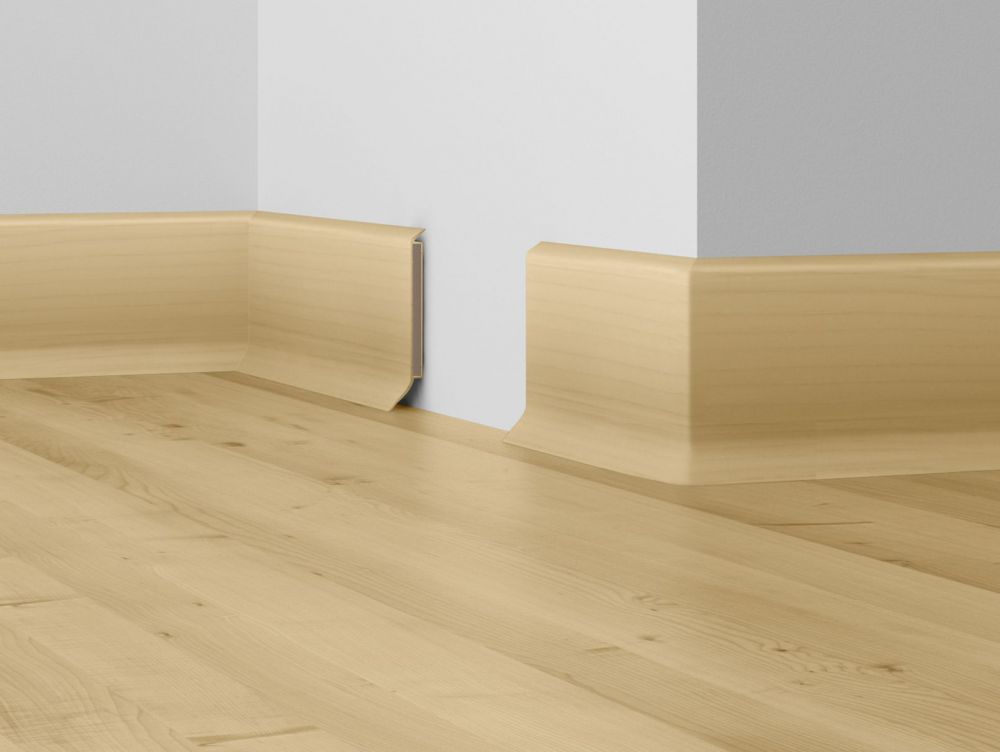 Тонкий плінтус підлоги KSO 80 - це німецький плінтус виробництва Долькен, який виготовлений на основі ХДФ (деревоволокнистої плити) з хвойних порід дерева і обрамлений високоякісним полімером, який не містить небезпечних для здоров'я речовин, у тому числі не містить хлору.